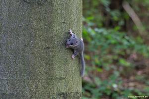 Angelockt von den vielen Bucheckern turnt ein junges Eichhörnchen im Baum herum. Im strahlenden Schein der Morgensonne kann man gut den dunkelroten Grundton im Fell erkennen, durchzogen von mehr hellen roten und eher dunklen Stellen. Das Tier zeigt keine sonderliche Scheu, als es knapp zehn Meter vor der Kamera sein Frühstück einnimmt.