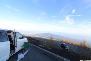 Ich bin kurz nach halb neuen am Parkplatz der fünften Station angekommen. Von hier aus habe ich den Weg zum Hoei-Krater genommen, den Ort des letzten Ausbruchs um Jahre 1707. Bild IMG_447 zeigt das Innere des Kraters. In der Mitte des Kraters angekommen, scheinen die verbliebenen 1350 Höhenmeter bis zum Gipfel des Berges, je nach gewählter Perspektive, garnicht mehr so weit.