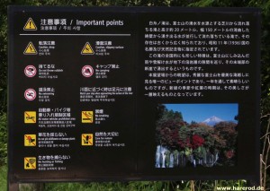 Wie an anderer Stelle bereits beschrieben, hat Japan eine etwas eigenwillige Art für Höhenangaben von Bergen. Der gesamte Berg ist in zehn Abschnitte, sogenannte Stationen (合, "gou") unterteilt. Die fünfte Station (五合目, "gogoume") liegt dann an der Stelle, die angeblich der halben Zeit entspricht, die man, vom Fuße des Berges angefangen, für einen kompletten Aufstieg bräuchte. Wer auch immer die Einteilung vorgenommen hat, er muss einen ganz eigenen Laufstil an den Tag gelegt haben. Die Zeiten passen hinten und vorne nicht. Es ist sicher sehr reizvoll den Aufstieg auf Meereshöhe zu beginnen, weil man auf diese Art mehrere Vegetationszonen durchwandern kann.