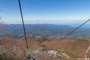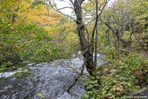 Nach dem Frühstück machen wir das Fahrzeug schnell abfahrtbereit und fahren um zwanzig nach sechs los. Schon nach wenigen Metern halten wir an der Shibukurokami-Brücke und geniesen den Blick in die herbstlich gefärbten Wälder von Akita.