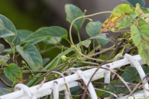 Etwas links oberhalb des Falters sitzt ein kleiner Frosch auf dem linken Pfosten und blickt nach rechts. Er beobachtet wahrscheinlich die Gottesanbeterin, die oben, etwa in der Mitte des Gitters inmitten der Ranken gerade dabei ist ihre Beute zu verspeisen.