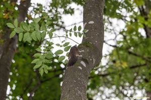 topEnde September 2022 turnt diese rote Eichhörnchendame im Walnussbaum vor meinem Bürofenster herum. An Arbeit ist vorübergehend nicht zu denken, also stelle mich mit der Kamera auf den Balkon und darf aus wenigen Metern Entfernung zuschauen, wie eine Walnuss verarbeitet wird. Die Nuss kommt direkt vom Baum, daher muss zunächst die weiche grün/schwarze Hülle entfernt werden. Danach gilt es die harte Schale der Nuss aufzunagen. Während ein leises, sägendes Geräusch zu hören ist, fallen feine Späne zu Boden.
