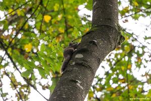 Angelockt von den vielen Bucheckern turnt ein junges Eichhörnchen im Baum herum. Im strahlenden Schein der Morgensonne kann man gut den dunkelroten Grundton im Fell erkennen, durchzogen von mehr hellen roten und eher dunklen Stellen. Das Tier zeigt keine sonderliche Scheu, als es knapp zehn Meter vor der Kamera sein Frühstück einnimmt.