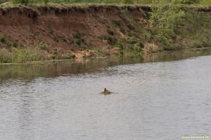 Nachdem sich die Sache etwas beruhigt hat, schwimmt man gemeinsam zum Nest. Sie springt schwungvoll aus dem