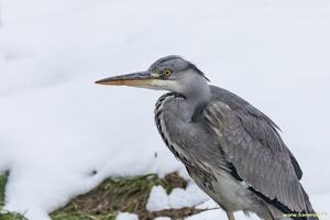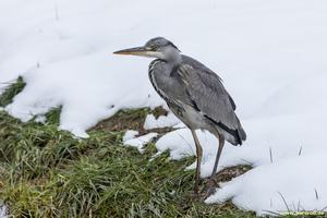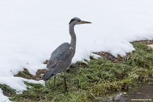 Anfang Februar 2026 steht ein Graureiher mitten im Ort am schneebedeckten Ufer und sucht nach Beute. Vielleicht ist es der Kälte und dem Hunger geschuldet, dass der Vogel die Kamera bis auf knapp 10m herankommen lässt, so dass schöne Aufnahmen gelingen.