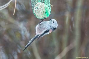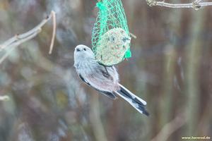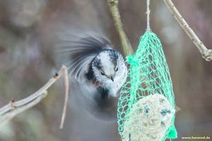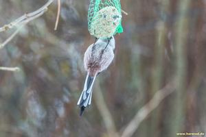Die Körpergröße der Schwanzmeise ist vergleichbar mit der Blaumeise, ergänzt um einen auffällig langen Schwanz. In Gruppen von meist einem halben bis einem Dutzend Mitgliedern durchstreifen die quirligen Tierchen Wälder und auch Gärten auf der Suche nach Nahrung. Am Vogelhaus haben wir sie noch nicht gesehen, aber in den umliegenden Sträuchern suchen sie zwitschernd nach Nahrung. Meisenknödel werden gern angenommen.