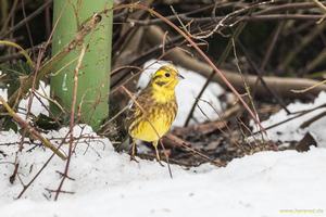 Anfang Februar 2026 liegt viel Schnee und hungrige Goldammern sind fast täglich im Garten zu sehen. Die Vögel sind weiterhin recht scheu und halten sich meist unter den Büschen versteckt. Selbst auf wenige Meter Entfernung verschwimmt das gold-braun gestreifte Gefieder für das menschliche Auge zu einem einheitlichen Braunton. Die dunkleren Weibchen sind schwer auszumachen. In einem glücklichen Moment leuchtet ein Männchen im Sucher der Kamera.