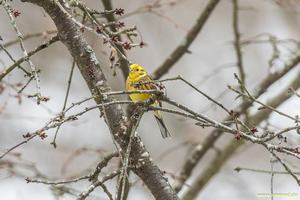 Auf Bild 3825 mischt sich an einem regnerischen Spätwintertag ein Buntspecht unter die in den Baumwipfeln versammelten Stieglitze. Eine Blaumeise rundet das Farbenspiel ab.